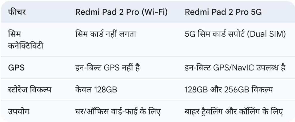 8. मुख्य अंतर: Redmi Pad 2 Pro (Wi-Fi) vs Redmi Pad 2 Pro 5G
